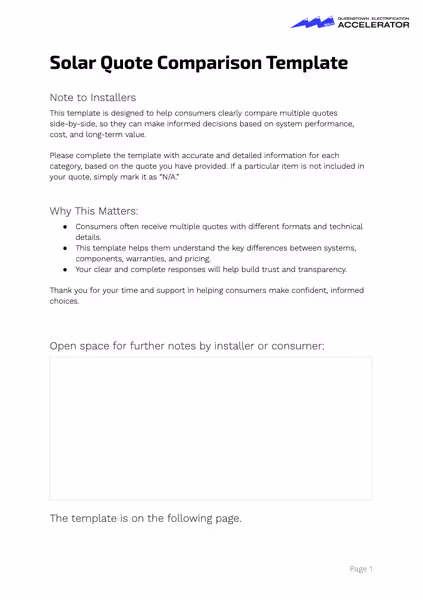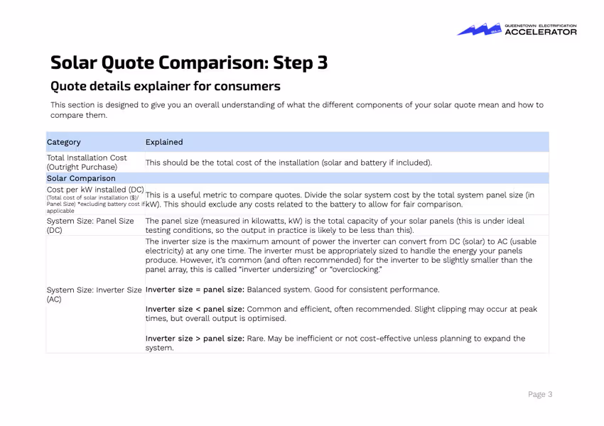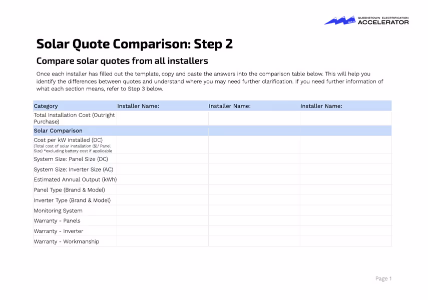 Step 1: Quote TemplateStep 2: Comparison TemplateStep 3: ExplainerNot all solar quotes are created equal. This tool helps you break down and compare key details like: